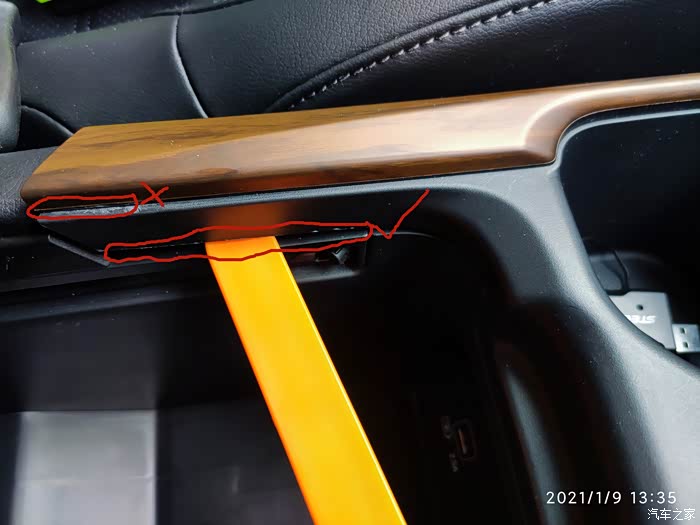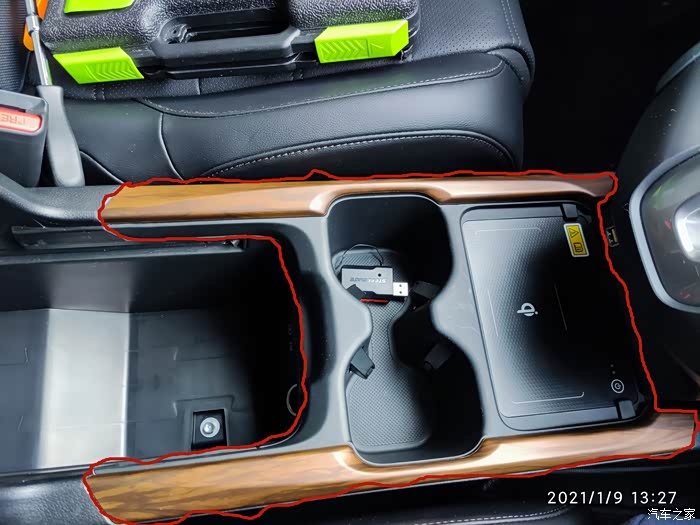 来一个扶手箱前杯架和无线充电区整体图,注意红色圈住的地方,这块区域是用卡扣固定住的,我们先要把这块撬开