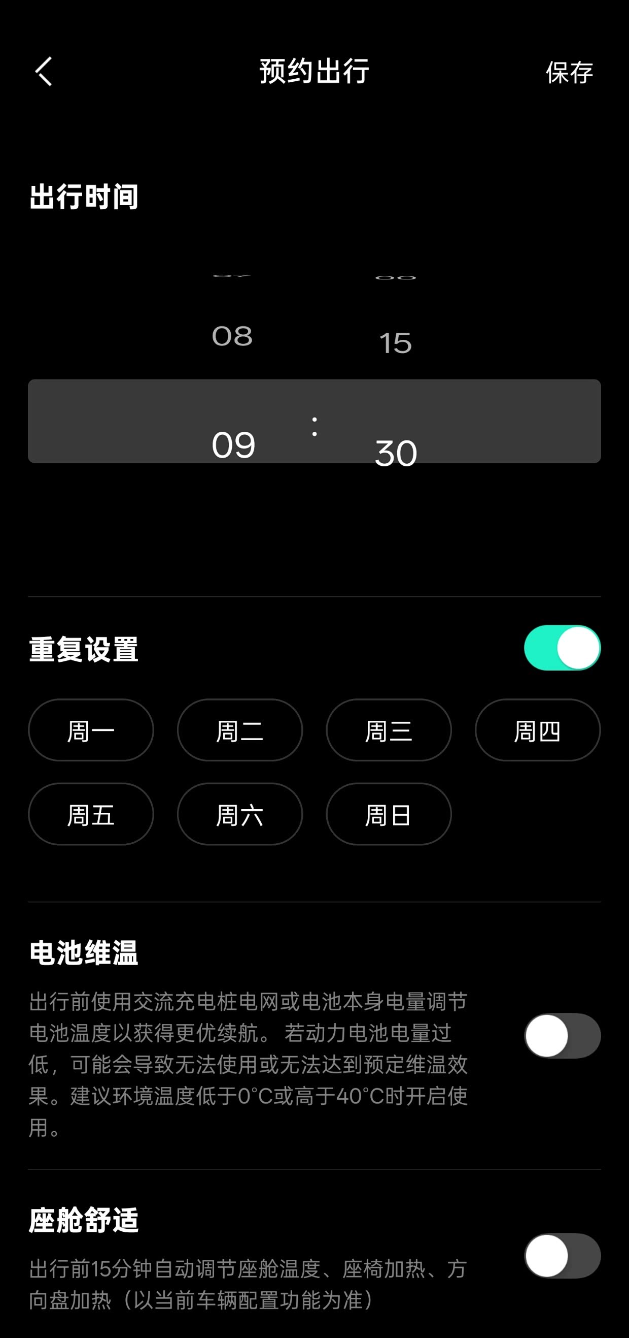 手机APP可预设每周重复预约,工作日自动预热车辆