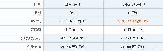 1. 尺寸上370Z比G37S短了将近40cm,车身更宽更低,轴距更是缩短了30cm,少了第二排座椅之后让车型设计得以更加紧凑。370Z的重量更轻,比G37少了将近200KG等于少佐两个胖子,在赛道中的感受也是操控更犀利。