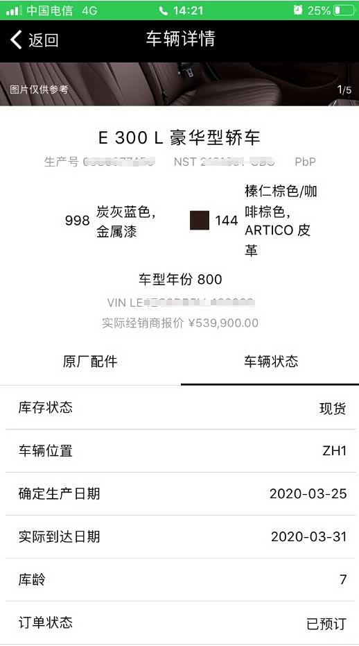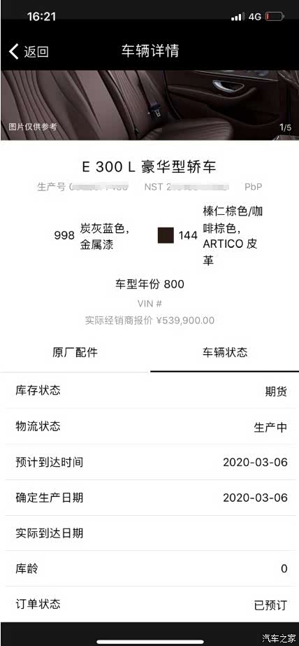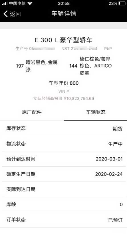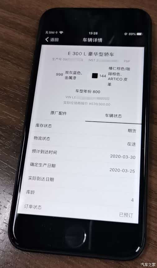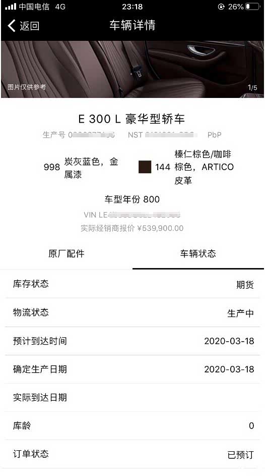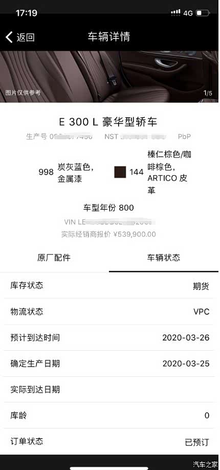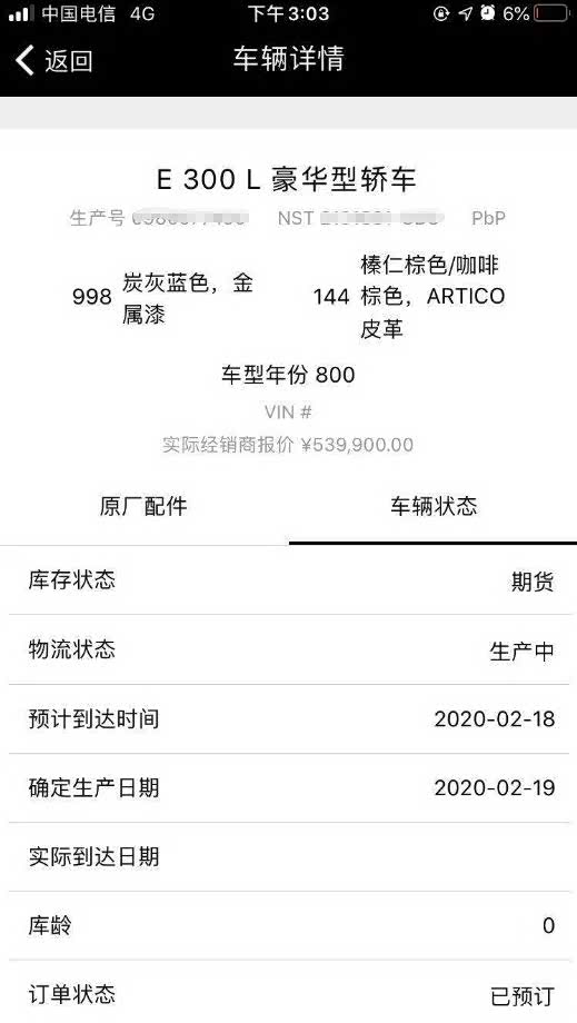 事实证明没那么快,也不知道是因为我的定制包的问题还是什么,眼看着论坛里其他车友050版的车子都已经开始排产了,我的还是没有进一步消息。重点是用车架号也迟迟查不到车辆信息。一直到3月26日时候订单系统才再更新,此刻有重大变化,显示生产日期是3月25日,物流状态首次变成了VPC。这个应该说明车子已经下线了。随后我还去论坛里搜索VPC翻看了奔驰各个车系的车友等车时VPC状态下几天后到车。