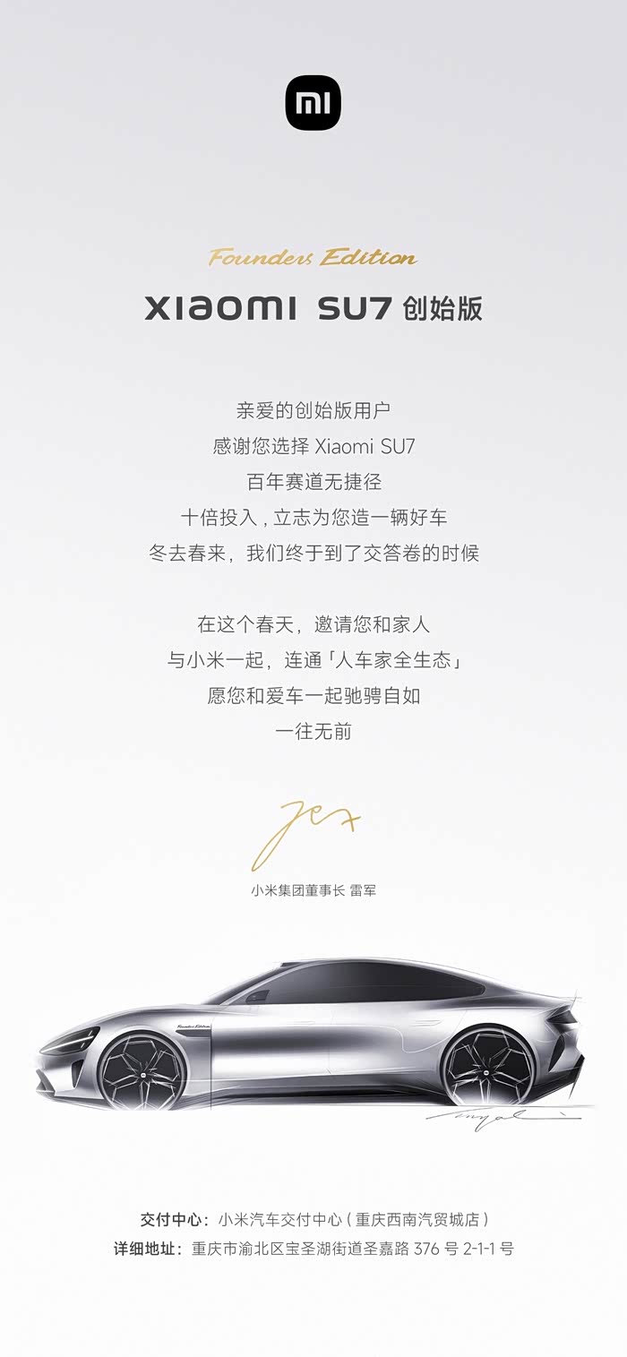 终于,在清明节假期前夕,迎来了翘首以盼的小米su7创始版!身为首批车主,我深感荣幸,也怀揣着满满的期待,与大家分享我的提车之旅。首先简单介绍下我的配置:创始标准版紫外灰内(本来想选紫外紫内,怕太骚没敢选)