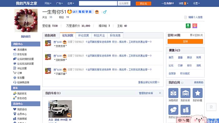 本人成为车主论坛会员虽然已经将近10年,但是由于之前几年工作比较忙,真正上论坛学习用车知识、沟通交流、回复发帖的时间并不多,在论坛潜水的时间相对比较长。从去年开始,由于工作岗位和职位调整,相对自由的时间突然增多,经常上车主论坛学习各种用车、养车知识的时间也自然而然多了起来,在管理员、版主和车友们的帮助下,积极参加车主论坛组织的各种用车和养车知识讨论,也经常发布自驾游帖子、用车评论帖等,发帖选题能力和质量水平也是逐步提高,既交到了车主朋友、学到了用车和养车知识,也获得了比较丰厚积分奖励。我购买途观以来,爱车已经做的5次保养全部在4s店,而且基本上每次都是积分、抵扣券、工时折扣优惠全享受的。