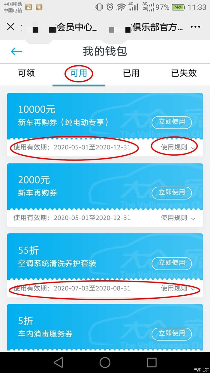 汽车厂家车主论坛的会员资料中的钱包中的已用优惠券1。