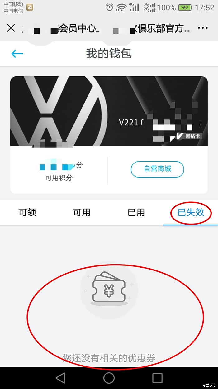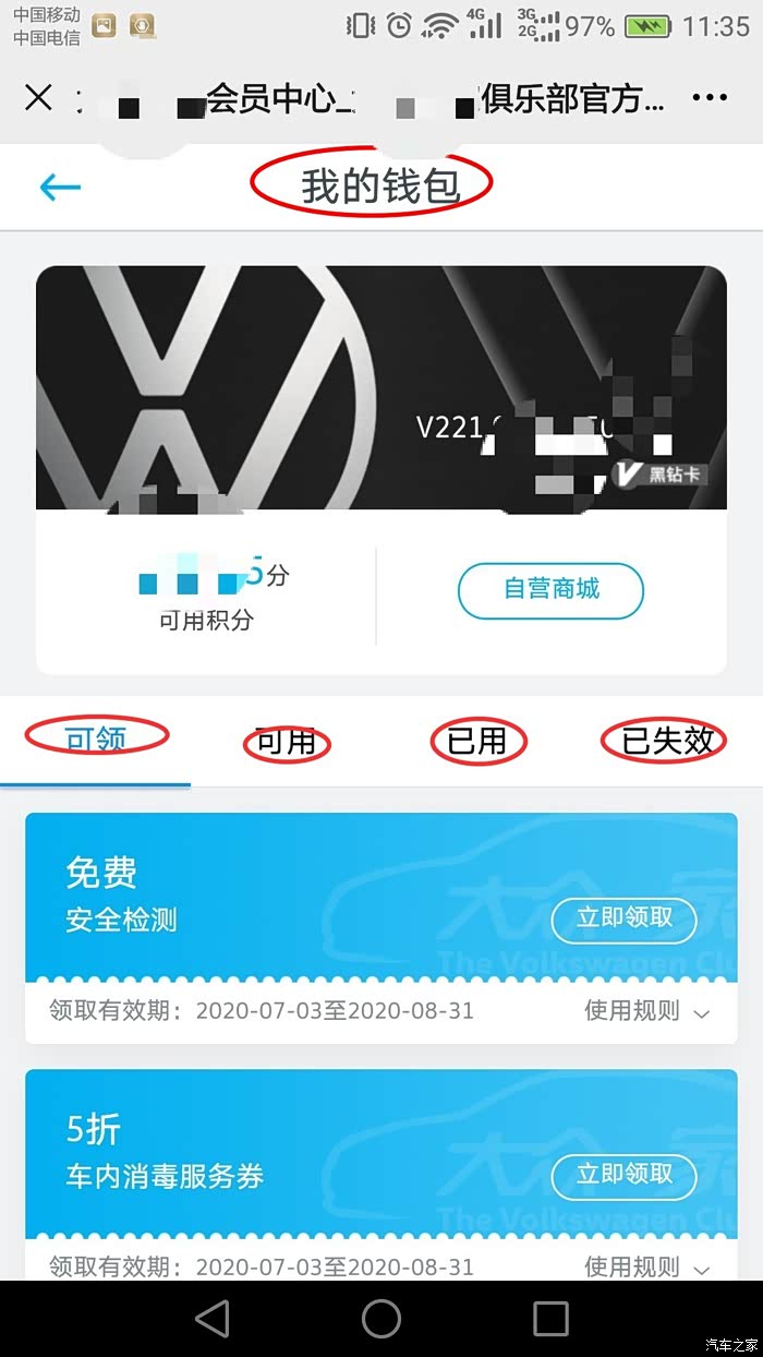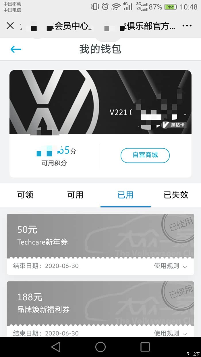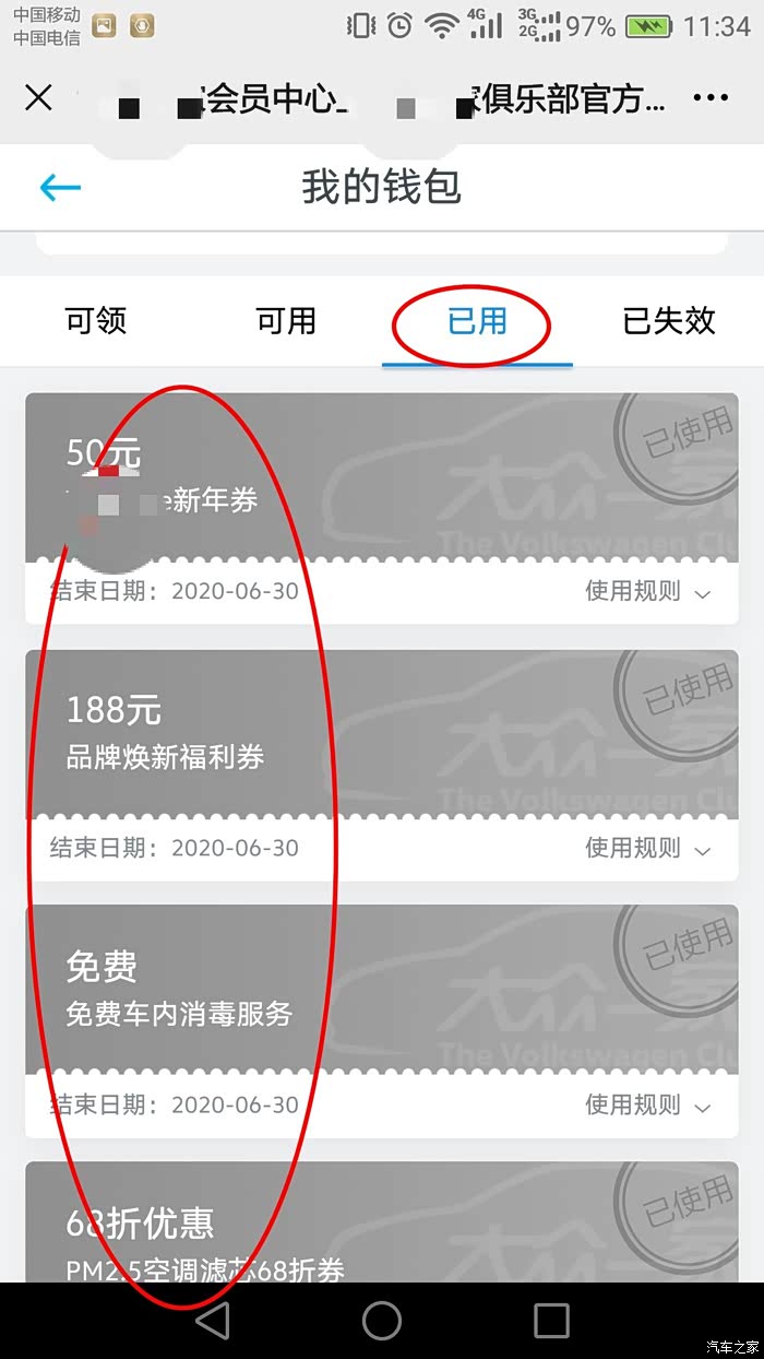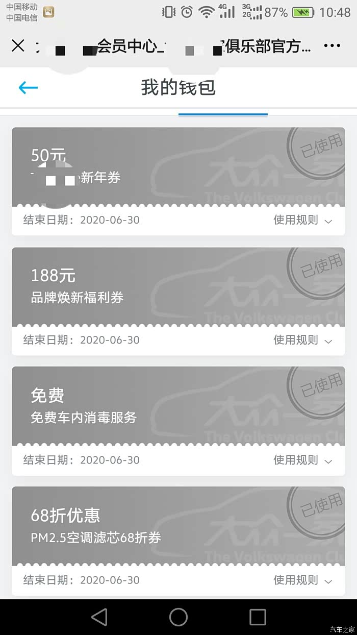 汽车厂家车主论坛的会员资料中的钱包中的已用优惠券2。