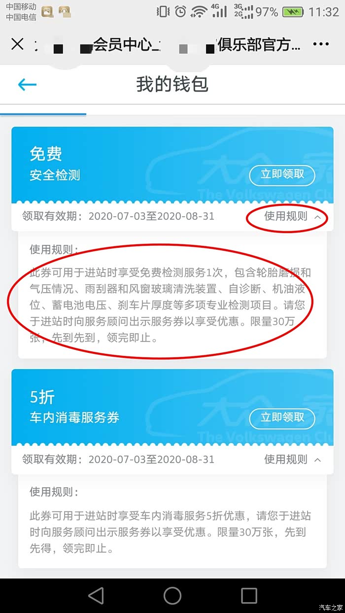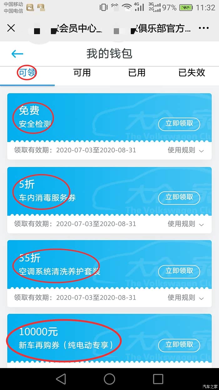 经常浏览车友群和车主论坛及时领取发放的现金抵扣券、免费服务券等。车主论坛一般会时而不时的发一些188元、50元金额不等的福利券、新年券,配件购买折扣券,还有的时候针对非常时期发布免费服务券等,这些券都是有数量和领取时间限制的,所以一定要及时领取。当然如果加入了车友群的话,一定要经常去车友群看看,跟车友交流用车体会、为车友顶顶帖子,还有热心车友会在群里发言提醒大家领取各种优惠券的。