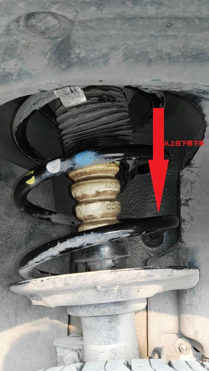 第二种,主要表现为低速通过稍微不平整的路面就会有咯、咯、咯的声音传上来,感觉是底盘打铁的声音,实际是右减震平面轴承坏掉,需要更换,或者直接换总成,但是要拆很多东西,也不影响安全行驶,目前我找到的解决方法如下: