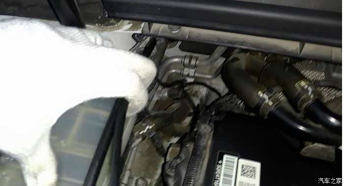 观致的节气门位置之变态,我也没话说了,这是一个侧面图。下面这坨就是比较软的进气管道,再下面就是一个硬质的管道,之间用不锈钢卡箍连接,这里比较好拆,只需要一字螺丝刀就行,但是这个角度很刁钻,分分钟让你脱力,满头大汗;拆完管子后,空间就出来了,可以上套筒和延长杆、万向节用棘轮扳手拧螺丝了,四颗螺丝都朝下,使用8mm套筒,其实1/2的杆有点粗,影响拆螺丝,建议有条件的似乎用3/8扳手和套筒,延长杆。其实这里我就已经想骂人了。上面说的火花就是在这里突然发生了,我的延长杆不知道碰了哪里,就闪了一个大火花,吓得我马上钻出来,确认没啥问题后继续。螺丝拆掉后,把供电和信号线的插头拔掉,比较难拔,我上卡扣钳了,结果用力过大,把一边的卡扣弄断了。哎,郁闷。拔掉这根线后,节气门就下来了,要注意别摔了。