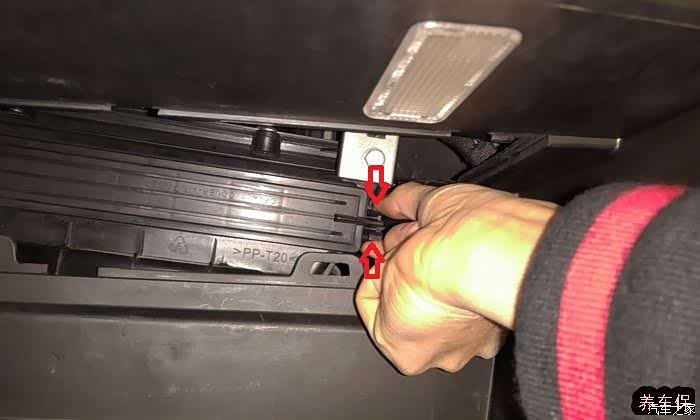 左手从这里伸进去,取出机滤盖和滤芯,注意这里通道很窄,还很割手,我的胳膊被划了一道,鲜血直流。建议垫一块毛巾,或者穿着长袖伸进去;对你手臂的弯曲极限是个考验。 左右手你怎么舒服怎么来。