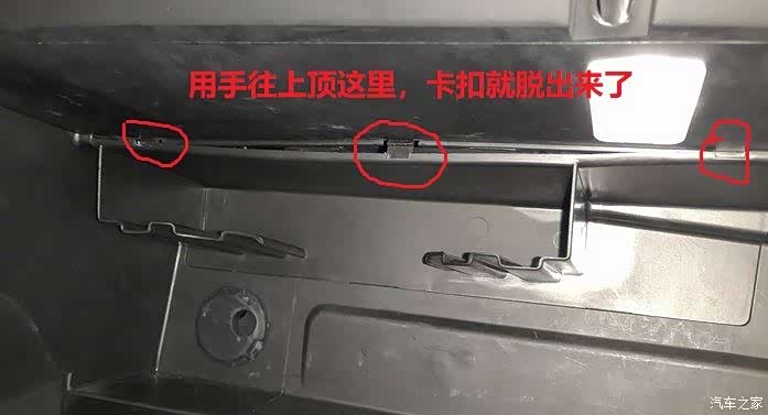 会看到这里有三个卡扣,往上推卡扣旁的塑料板,卡扣就脱出来了;