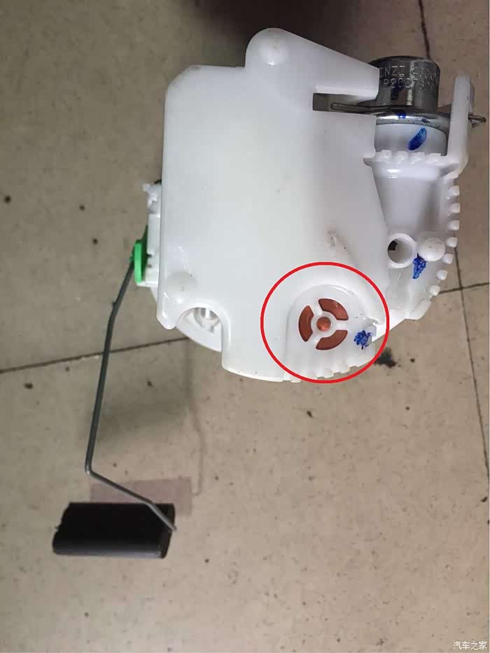 油泵的底部有一个红色的小开关,用一只手把油泵竖直提起来,另一只手就去按这个红色小开关,汽油就会都流出来到油箱里,这时候再把油泵拿出来就可以了。橡胶密封圈也跟着拿出来,先套到新的油泵上;