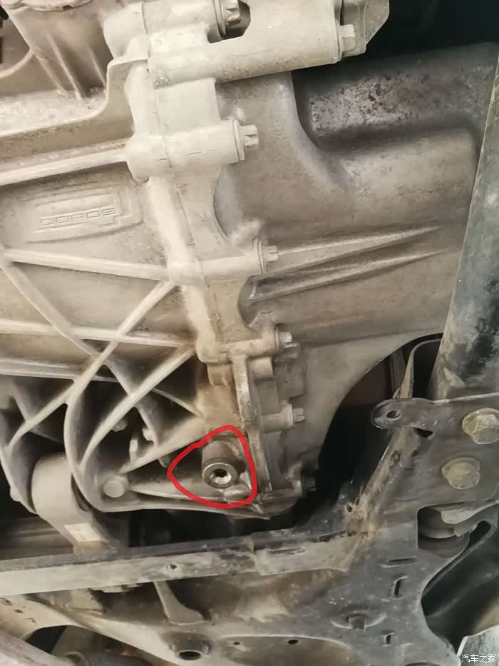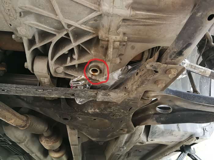 变速箱油放油螺丝在这里,驾驶位那边的车底,需要内六角8mm的套筒来卸掉,将油放出来。