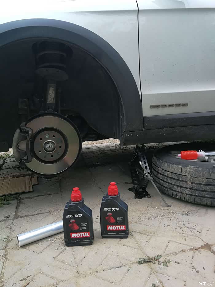 准备工作要做好,摩特的dctf变速箱油,需要两桶,一桶不够,很多大神已经验证过不错了,比原厂的要好,换上以后也确实如此。首先,用千斤顶顶起车身,卸下左侧轮胎,准备好变速箱油和保鲜膜,主要是用来防止油流到副车架上。
