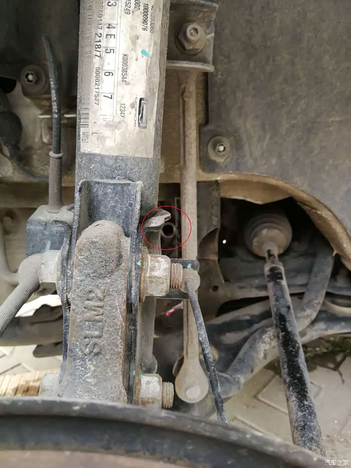 到右减震那里,用千斤顶把前轮抬起来。把这个包皮撸上去。,把里面白色头部(一块减震胶块)使劲弄下来,得使劲,因为这个胶块卡在上面。。弄下来后喷矽质润滑剂。然后再把这个橡胶块卡回去就行。