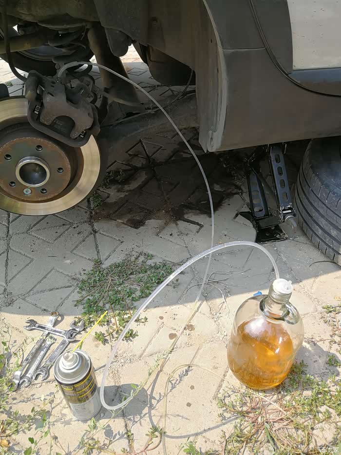 建议拆掉轮毂,这样好操作,我使用的是之前换冷却液的那套装备,不同的是,我在另一头接了一节硅胶管,正好套在刹车油更换口上,刹车油有腐蚀性,还是收集一下最好。