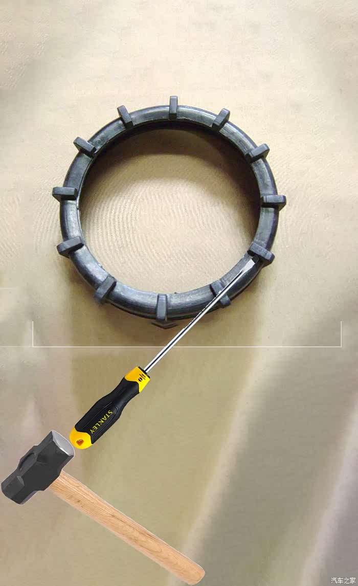螺丝刀的金属杆尽量用胶带绑起来,以免下面的操作与旁边的车体金属接触产生火花,用螺丝刀抵住盖子的棱,通过用锤子敲击将这个盖子逆时针旋转,注意力度,旋转大约两周就可以了,拿这个盖子出来的时候,右侧的油管可能会碍事,小心一点拿出来,因为这时候油箱内的汽油就基本暴露在外面了。这时候就可以把油泵拿出来了。一定要慢。垂直拿出。