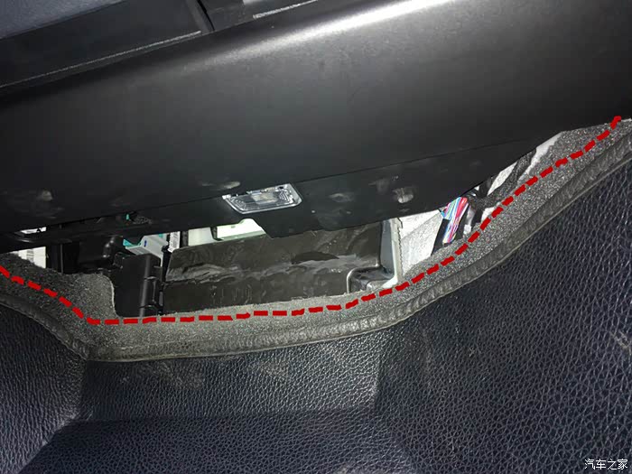 我是走这里过的,当时我已经撬开中控靠近门的那块侧板,但是发现里面全是硬塑料结构,要是从里面穿过的话,怕有异响,于是继续往下,就到了这里