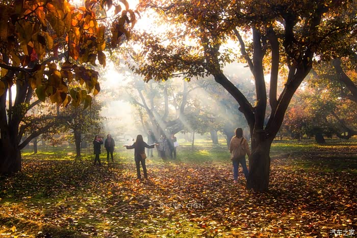 晨雾中的梨园游人如织