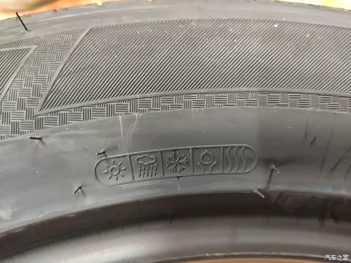 轮胎侧面有一些标识。其中包括代表不同天气环境下性能的标识,如太阳代表适合晴天使用,雪花代表适合雪地使用,雨滴代表适合雨天使用。这些标识表明该轮胎具有多天气环境下的适应性。