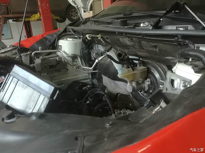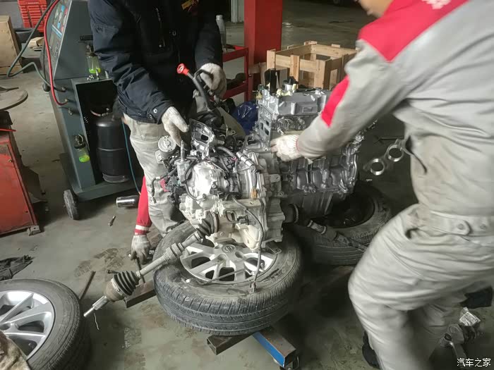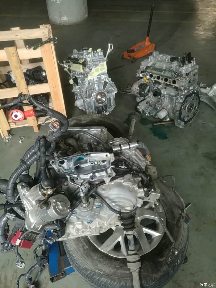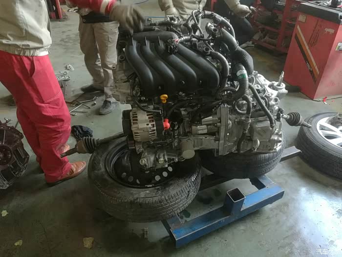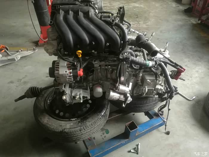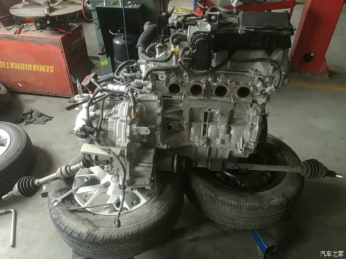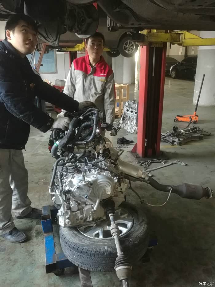 因单位有事,我赶到4S时,发动机已经全部拆下来了。这是发动机、进排气管和发动机托架。