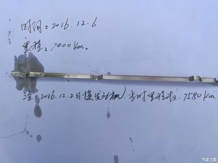 测试阶段:2016年5月,行驶2200公里,机油消耗快到中间绿点位置;2016年7月,行驶3000公里,机油消耗到中间绿点位置;2016年11月底,行驶5000公里,机油消耗快到下孔位置。