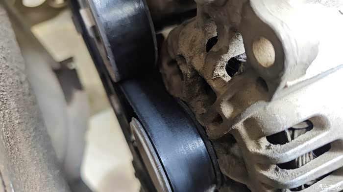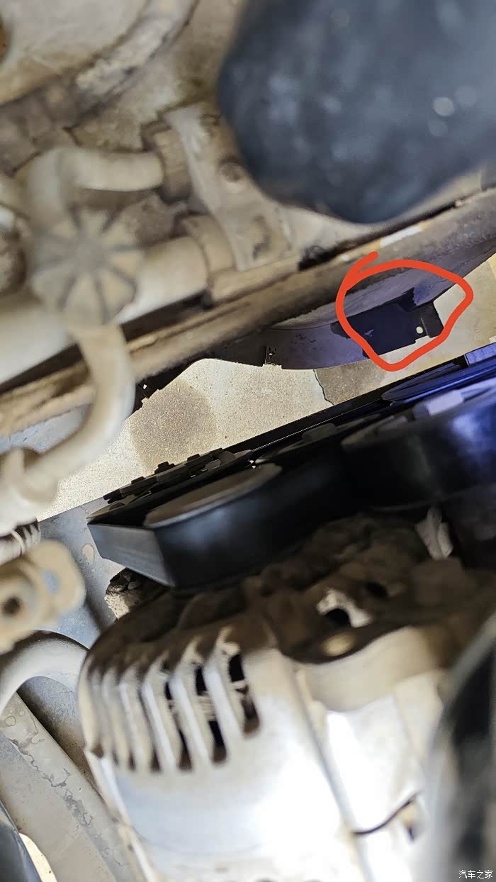 早上起来看见右前轮下面有水渍,打开机舱看了一下,不知道这里为何有水,防冻液也只是轻微少了一点。另外大家看看这个发电机皮带还能撑多久,买的二手车,12万公里