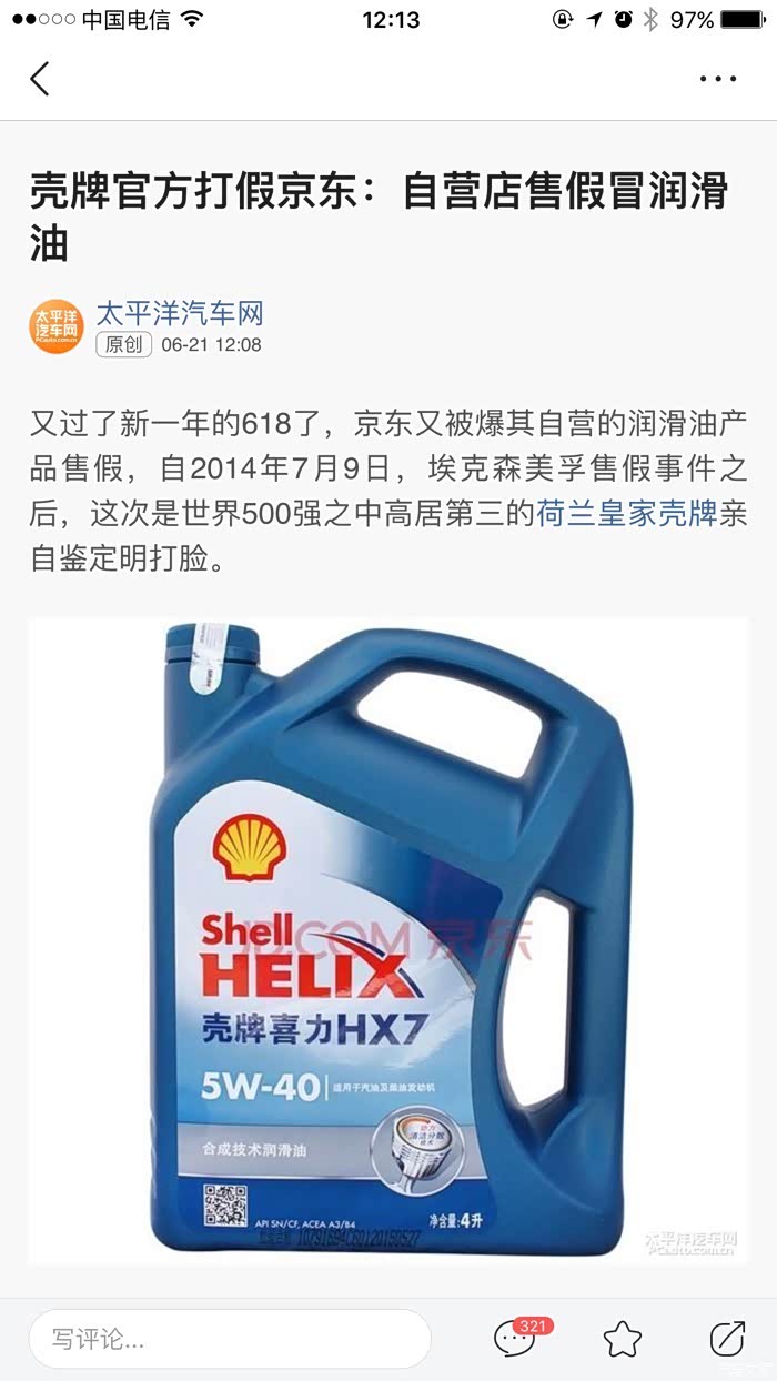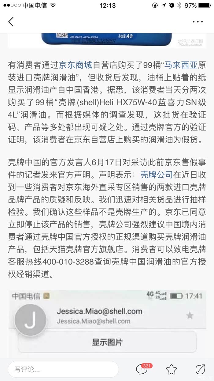 壳牌官方打假京东:京东自营店售假冒润滑油。 我叉…………