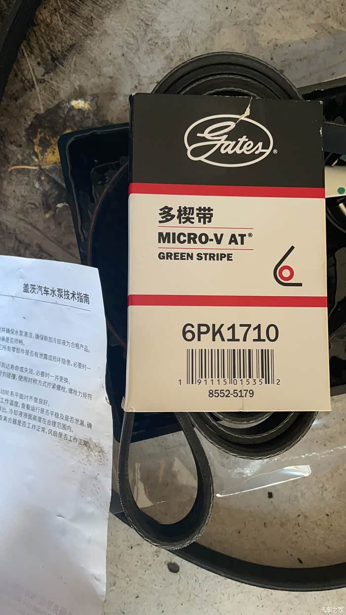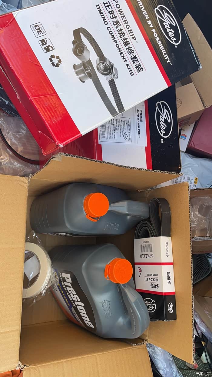 今天准备换的配件,正时皮带套装、发电机皮带、水泵,清一色盖茨。防冻液买的百事通。