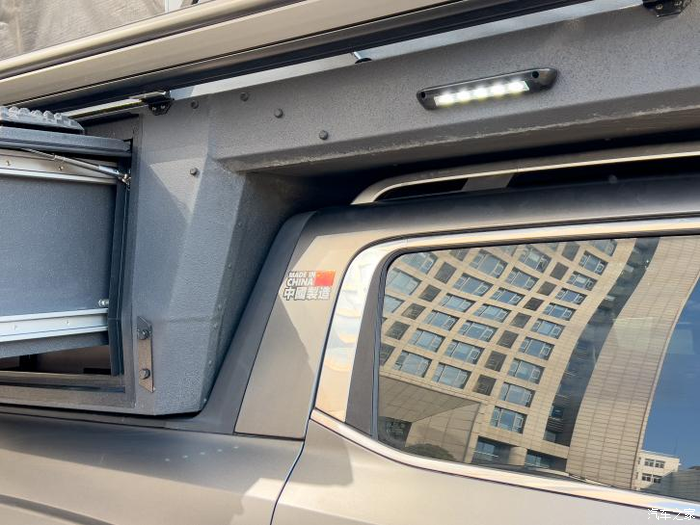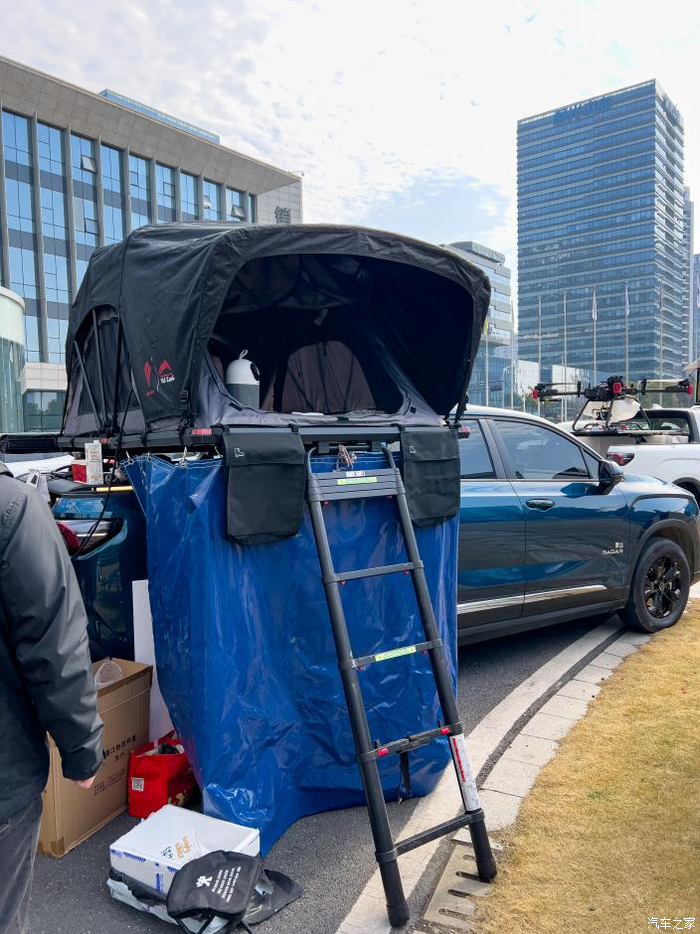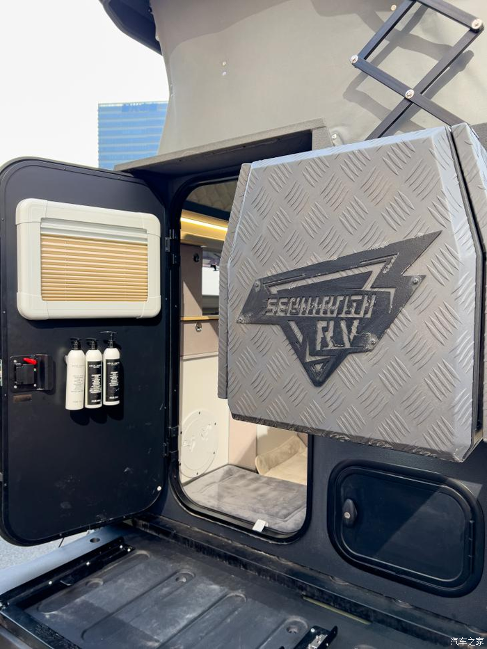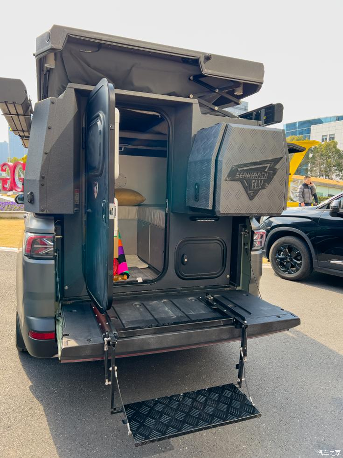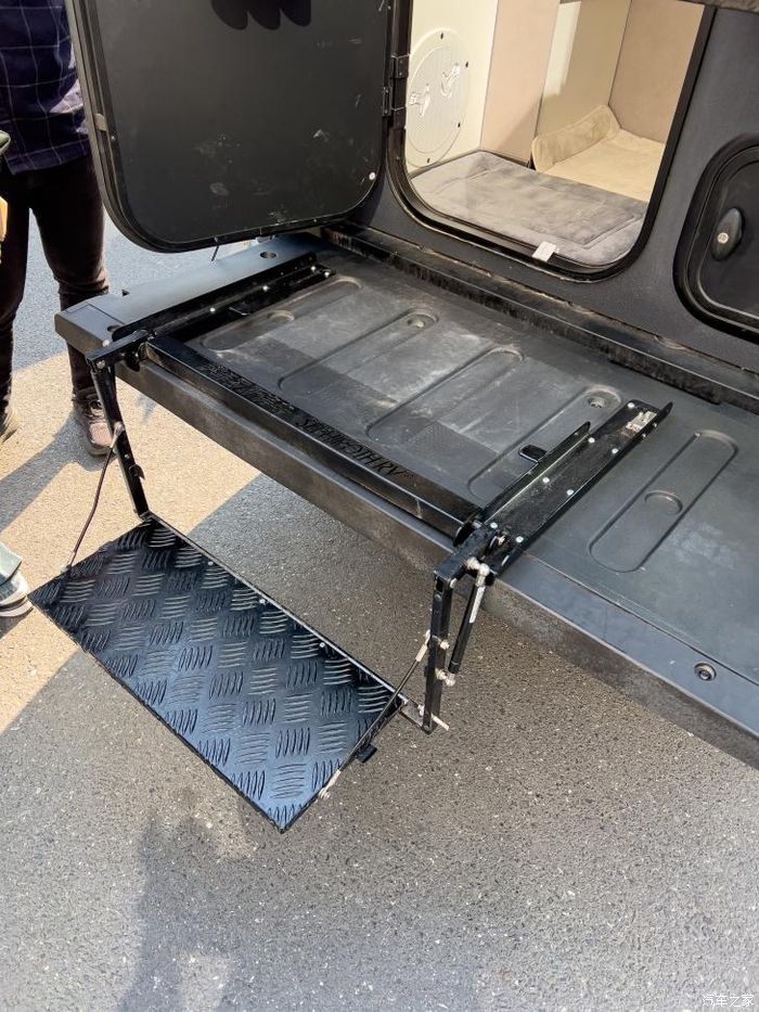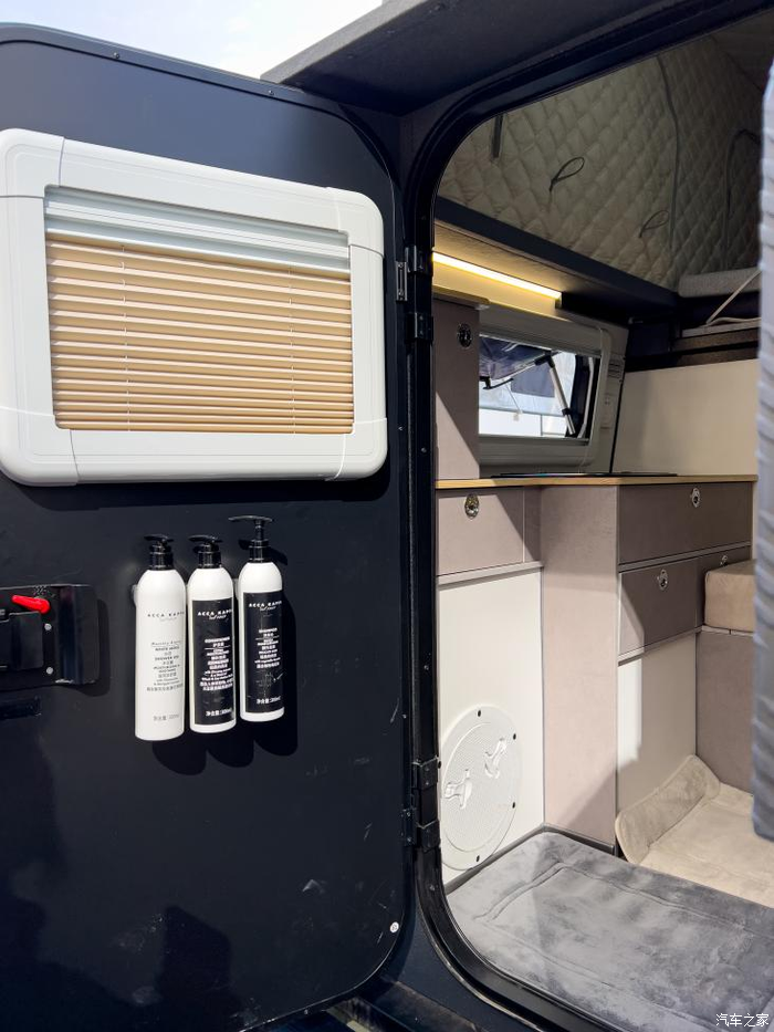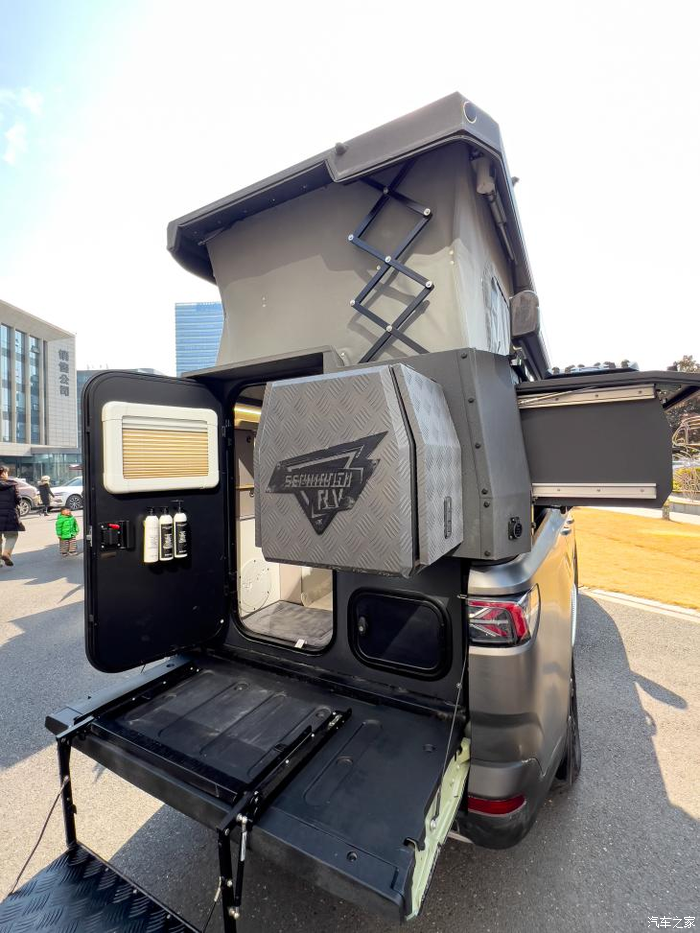 看到一辆改装房车,挺有想法的,车顶加装了个帐篷,打开之后相当于一个二楼,成年人可以平躺下,一楼可以坐也可以躺,车侧边有通风窗,户外露营没事的时候可以坐在一楼喝喝咖啡,看看美景。尾部加装了踏板,这样上后箱不费力,用电方面额外加装了250V电压。感觉这个车主应该是挺快乐的。