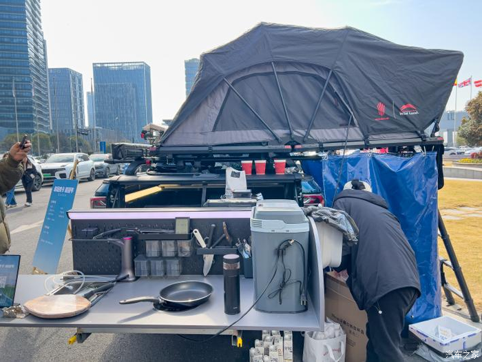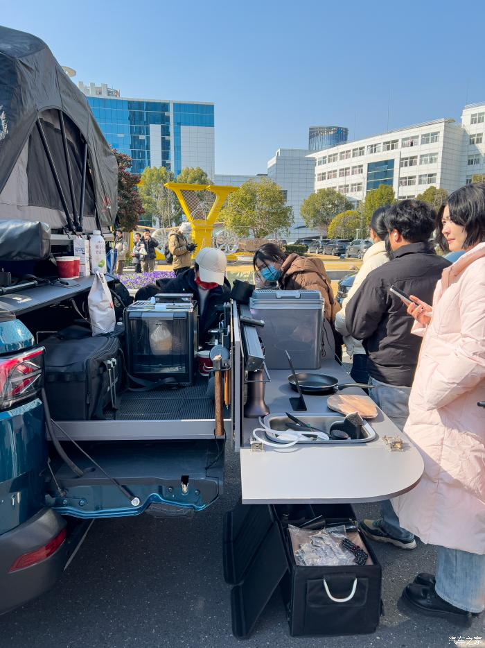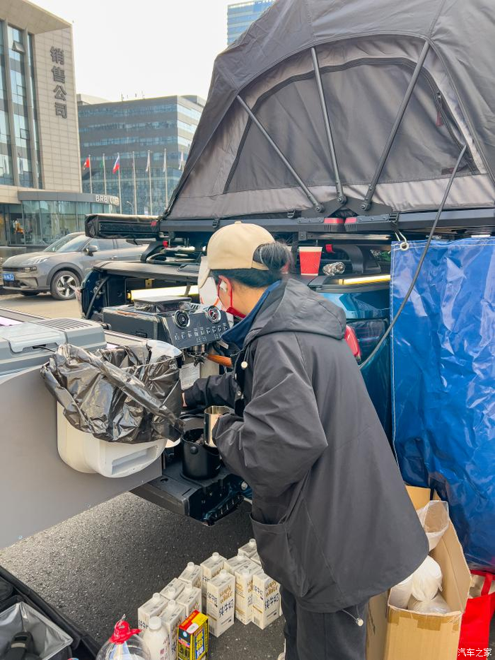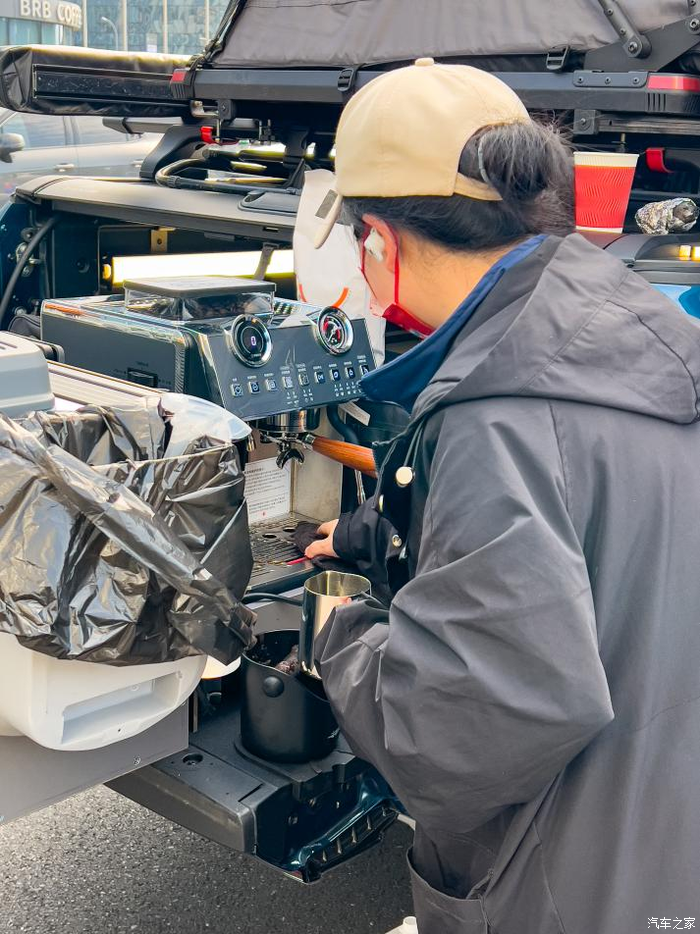 逛了一圈准备去找我的车主朋友,他跟人群一起围观一辆改装的雷达RD6在做咖啡,这辆车也是为露营而改装的,设备也很齐,跟上一辆的不同在于这款车更侧重于家庭出游,所以除了车顶帐篷,淋浴帘,露营桌椅套装之类的基础设备外,还增加了厨房用品,相当于一个移动小厨房。