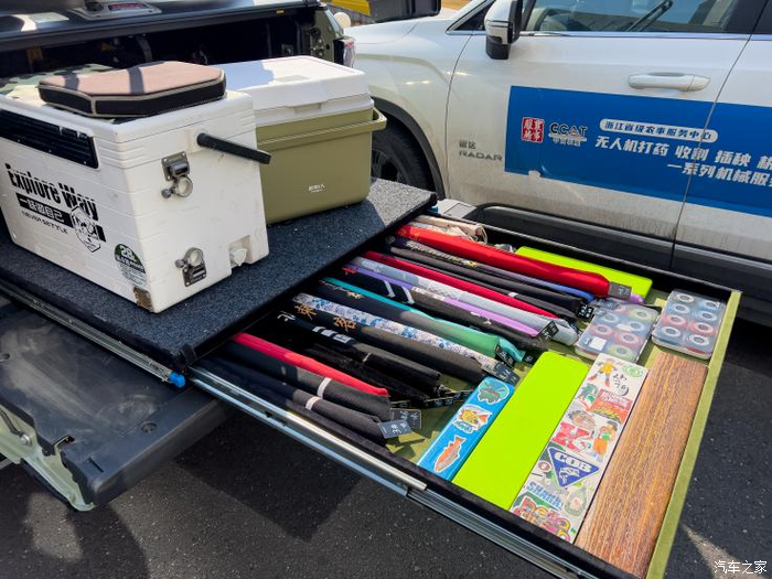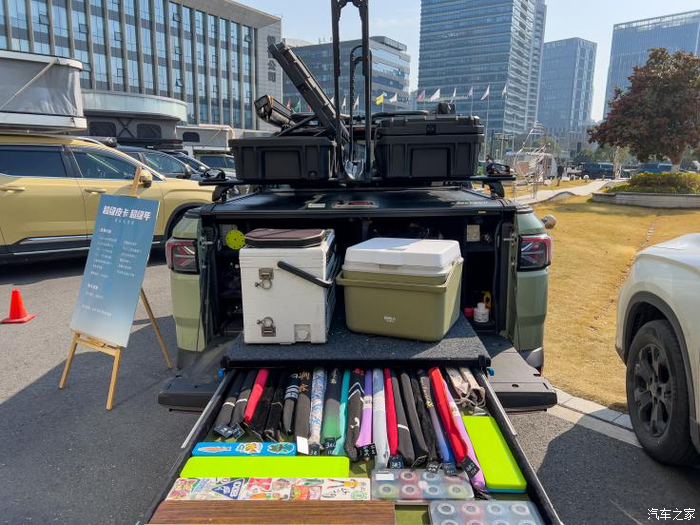 这辆钓鱼车改的挺有才,听介绍说,12项改装内容才1w出头点,而且设备齐全,什么扰流板,侧边帐,淋浴帐,装备箱还有折叠升降桌椅之类的都有,后箱这整齐得一排钓鱼竿看的我都羡慕。而且这位车主不仅是高级钓鱼佬,也是骑行爱好者,还加装了自行车架,钓鱼骑行两不耽误,没事还能露营。