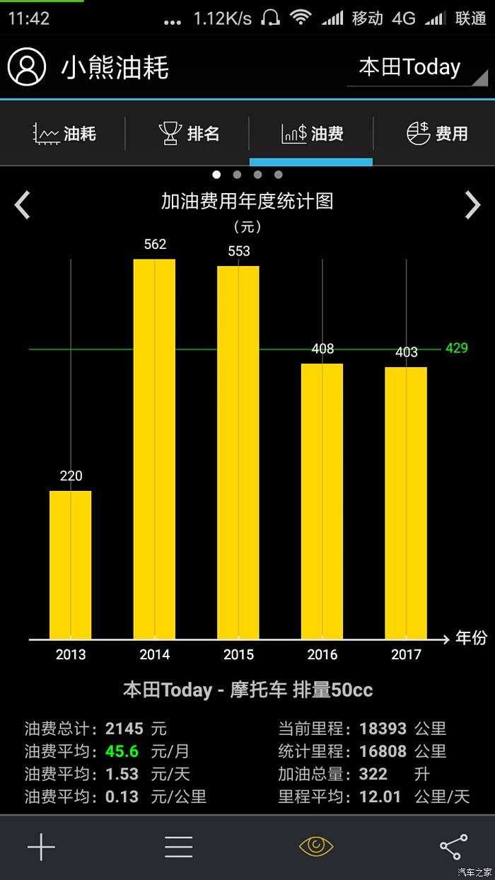 费用来说也是很低了,除去交强险什么的,爆胎,改装等等,也绝对是可以接受的范围。油费一个月不到50,一天不到1.53,真是比公交还省啊!