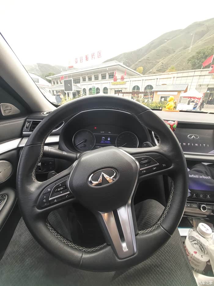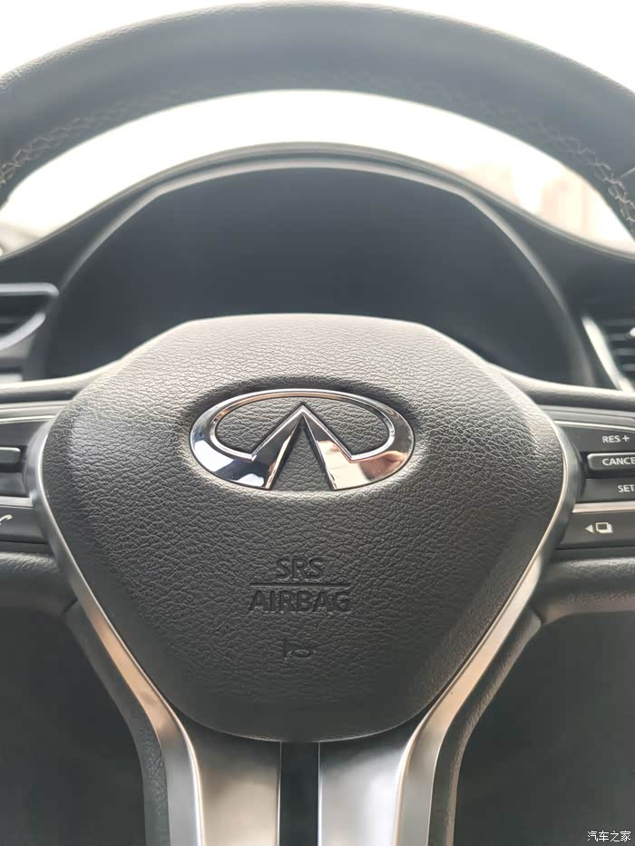 英菲尼迪qx50的方向盘采用的是圆形三幅式设计,中间为英菲尼迪的logo和喇叭,左右两侧为多功能按键,下方为银色装饰,整体看上去简约而大气。