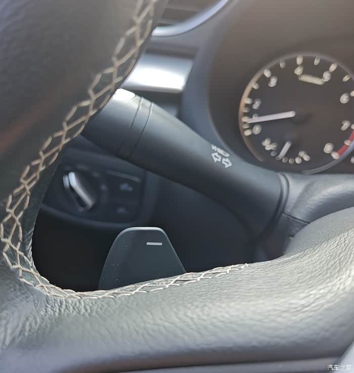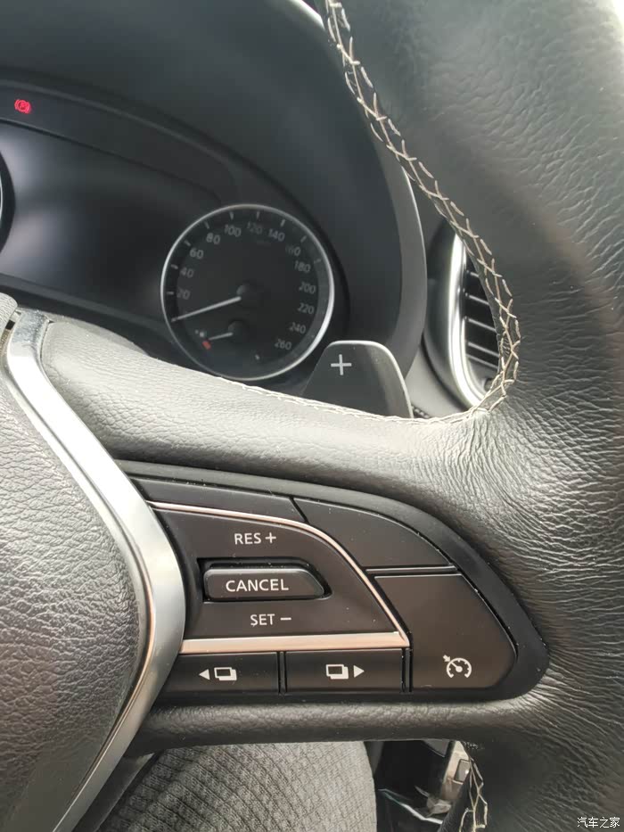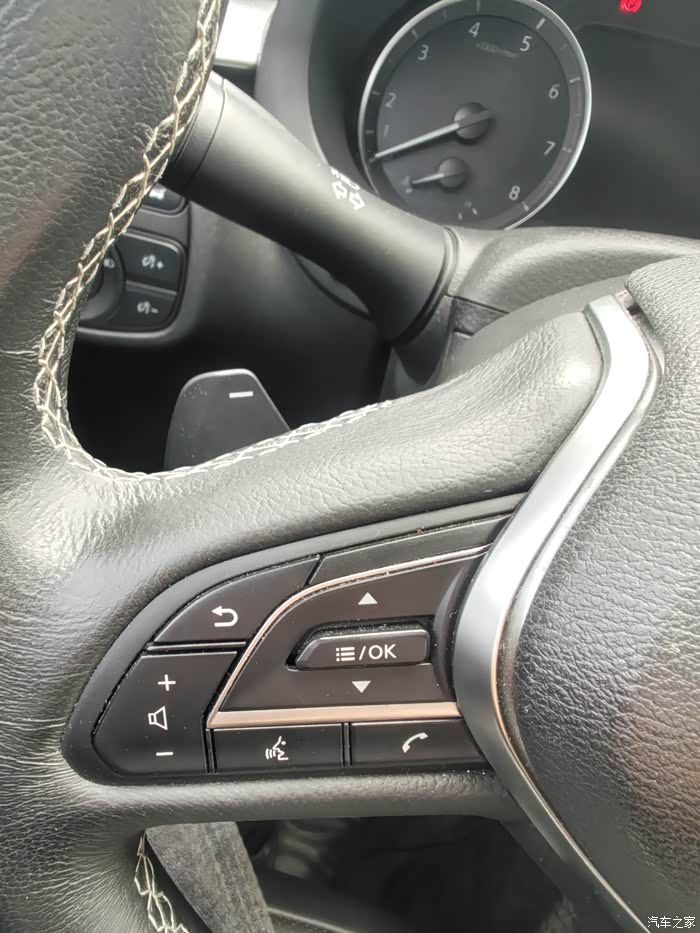 方向盘支持上下左右调节,高配的车型支持电动调节,我的这款只手动调节,在方向盘下面有一个拉手,往上抬起便可以进行调节,调到适合的位置后再向下压紧拉手便可固定方向盘。方向盘的左边按键为多媒体控制按键,分别是返回键,音量加减键,菜单选择和确定键,语音识别和电话接听键。右边按键为定速巡航键及巡航速度加减键,仪表盘的菜单选择键。整体按键的功能还是比较实用的,布局比较合理,平时按起来也很方便。
