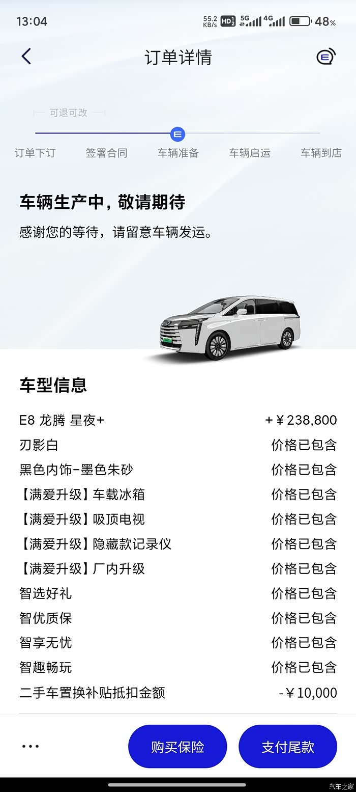 保险不到6000,该有的都有,应该还能再便宜点。说是龙腾版要等一个月左右,极力推荐MAX+说是基本差不多,电视什么的配件厂家发过来4s店也能装,其实选龙腾还是想要电视、记录仪,最重要的是米其林的那4条静音胎,说是静音相比老款有提升但来了之后还是有区别(小区有老款和新款实际体验了几天以后有感觉)所以还是选了龙腾版,再加上已经等了那么久我不差这一半个月(不影响领补贴就成,只要赶年底前能到就行),实际也就不到半个月,很快。