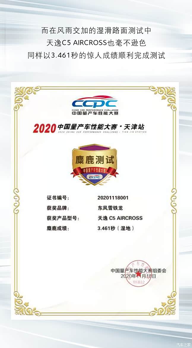 11月18日,东风雪铁龙 天逸C5 Aircross 在天津举行的2020年中国量产车性能大赛(CCPC)麋鹿测试中,以3.369秒的成绩勇夺全场第一,并刷新CCPC麋鹿测试三年以来的赛事记录,实力证明了舒适性与操控性"鱼与熊掌兼得"的完美平衡。(点击本段文字观看车家号链接)