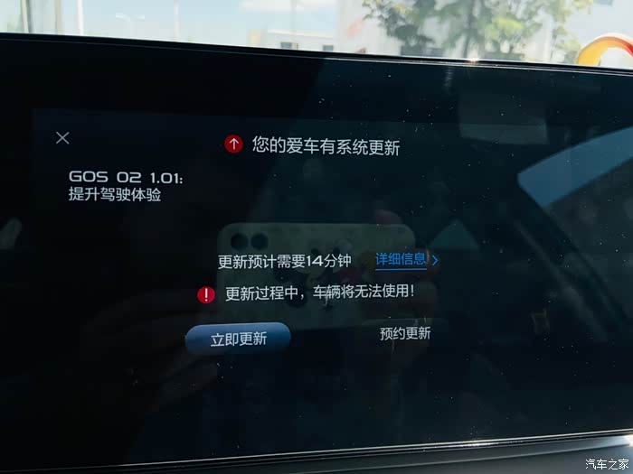 车子熄火下电之后就会提醒可升级了。点一下立即升级