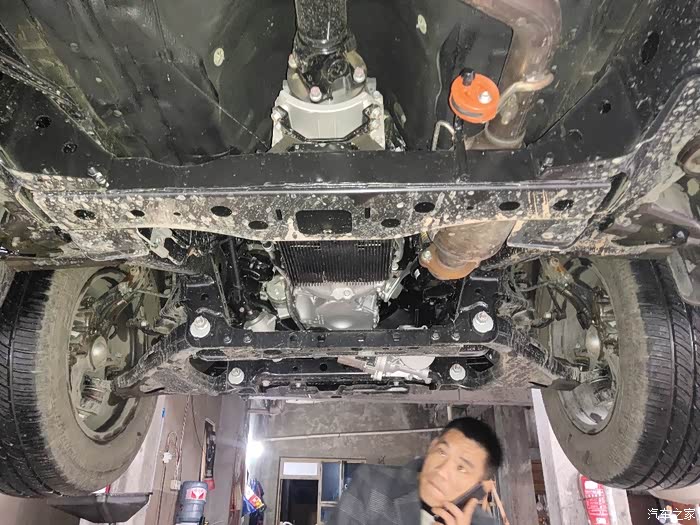 师傅开始安装长城炮前部底盘护板,买护板可以不选择安少50工时费,自己找地沟也可以安装,没啥技术含量