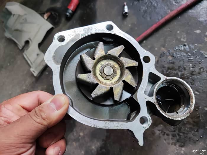 换下来的水泵:时间差不多了,机械都有寿命。水泵如果坏了单换,也要拆正时齿带,工时比材料还高。所以,这次就一并换了,力争再战十年!