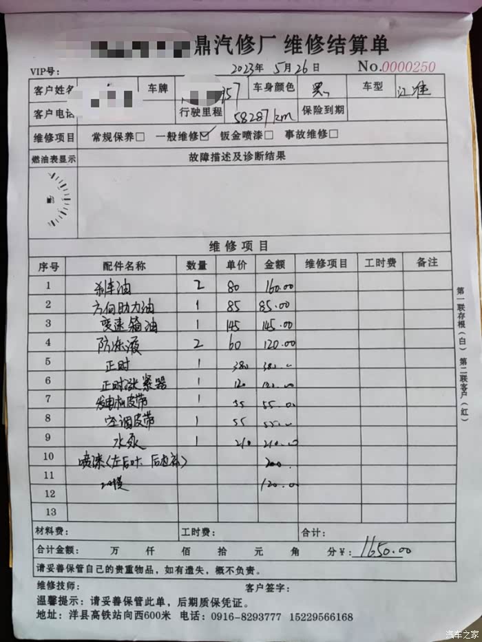 维修账单。同行,也是熟人,所以扫码付款。两处明显剐蹭,也一并收拾了