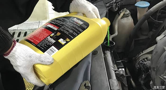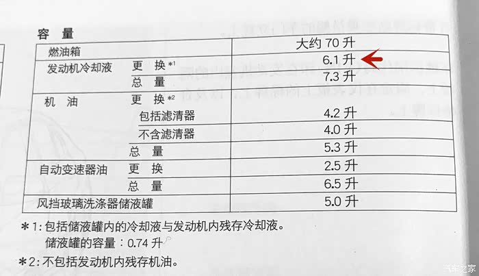 发动机冷却液总容量7.3升,更换量6.1升。(大小各一瓶正好够量)