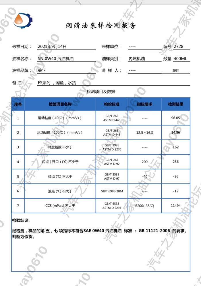 1.100度运动粘度,假14.86,很高,真13.04。美孚FS的粘度测过很多次,一致性很好,基本上都在13-13.5之间。