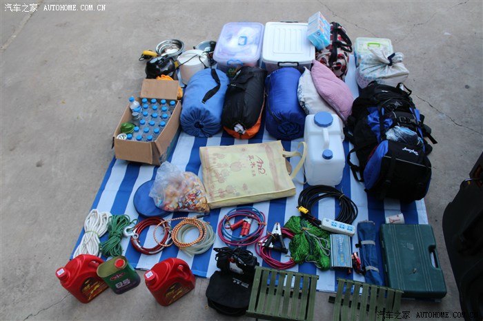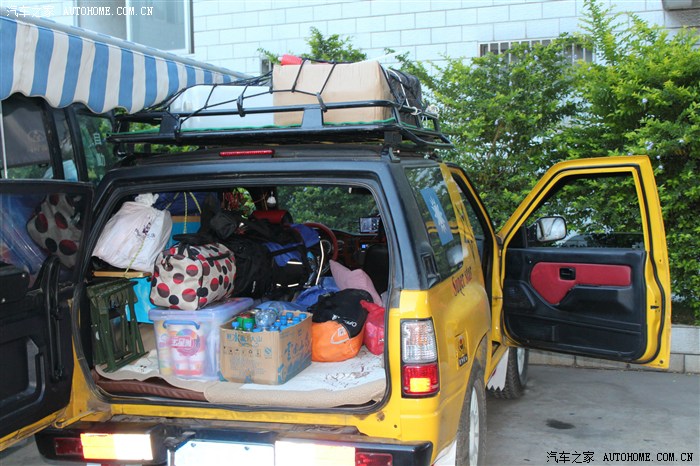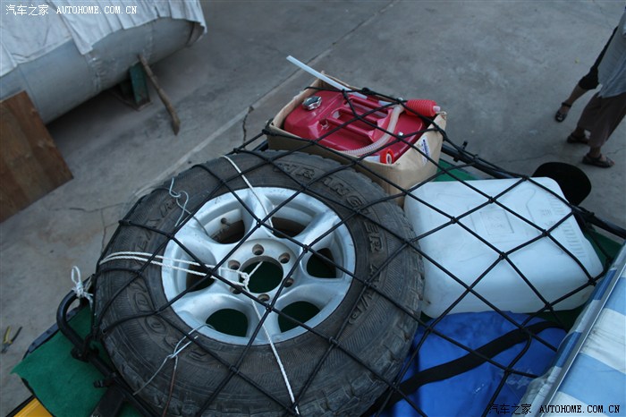 车顶上是这样子的(第二只备用轮胎用八号铁丝捆上、20升备用油箱、水桶、移动卫生间)