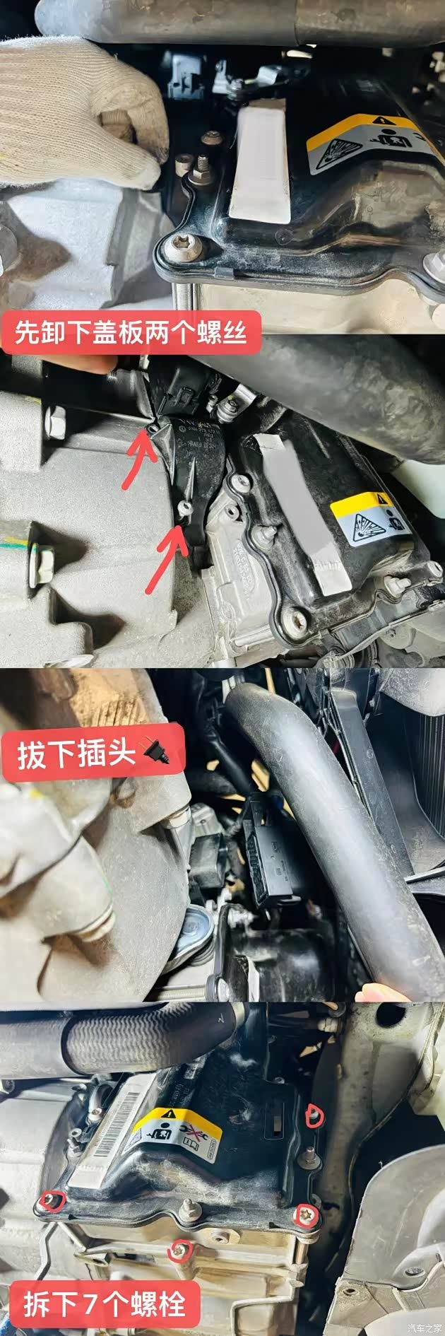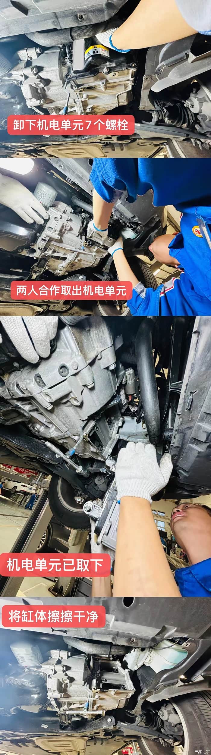 更换机电单元,先要将变速箱油加注口的盖卸下来,再把变速箱油放干净;然后把机电单元的电源数据线插头拔下来,拧下机电单元上的7个螺杆卸后才能再将机电单元取下来。此处位置狭窄,很难拿出来,可将整个变速箱向里推增大空间便于取出配件。然后把新配件按照拆卸的的反序安装回去即可。