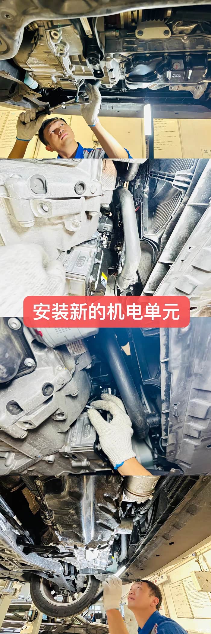 因为机电单元这里空间狭小,要么拆防冻液的管子,要么把发动机和变速箱向里推。如果拆防冻液管那防冻液会漏掉,要补防冻液,会增加维修成本,而这个费用不在索赔费用中。因此采用的是把变速箱向里推的方案。