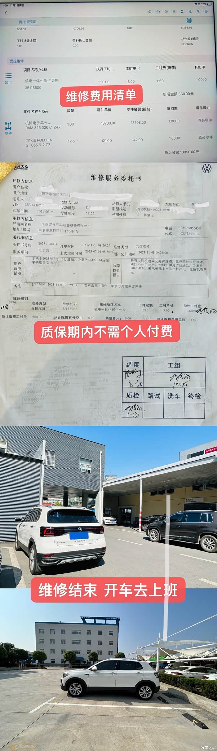 (机电单元 13708元,齿轮油 242元,工时费 660元,合计13950元。幸好在质保期不用自掏腰包。)