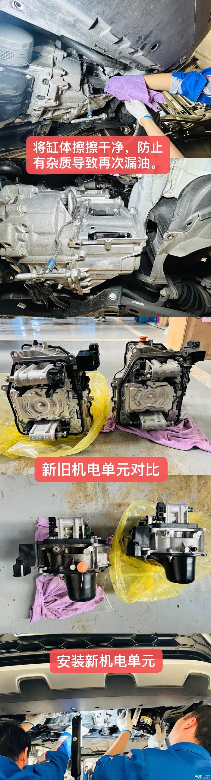 拆下机电单元后把变速箱擦擦干净,然后两人在协作把新的机电单元安装回去。可从新旧配件对比来看原车的漏油很明显,也可看出垫片是与机电单元一体的。