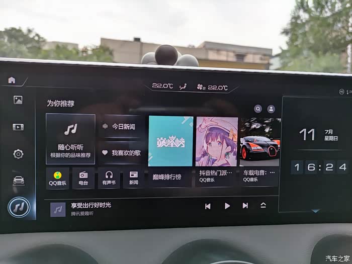 中控大屏。更新后有QQ音乐了。也可以听小说和相声。