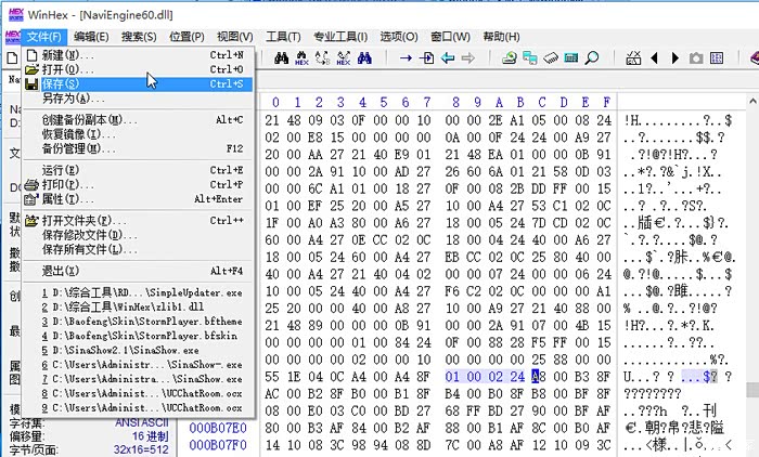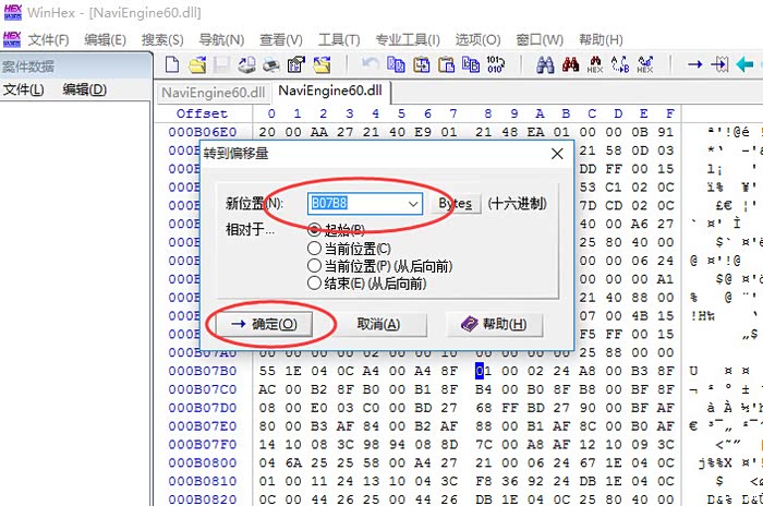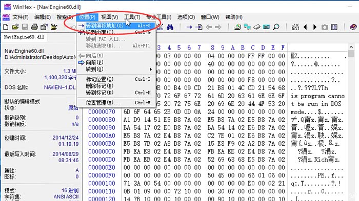 三、修改引擎文件。用16进制编辑器(以WinHex为例)打开导航卡Autonavi文件夹中的NaviEngine60.dll文件,依次选择“导航”——“转到偏移量”(依WinHex版本不同,选项略有不同,也可能是“位置”——“转到偏移地址”),