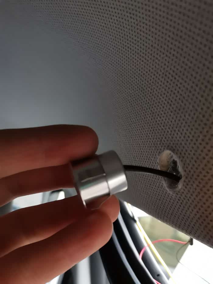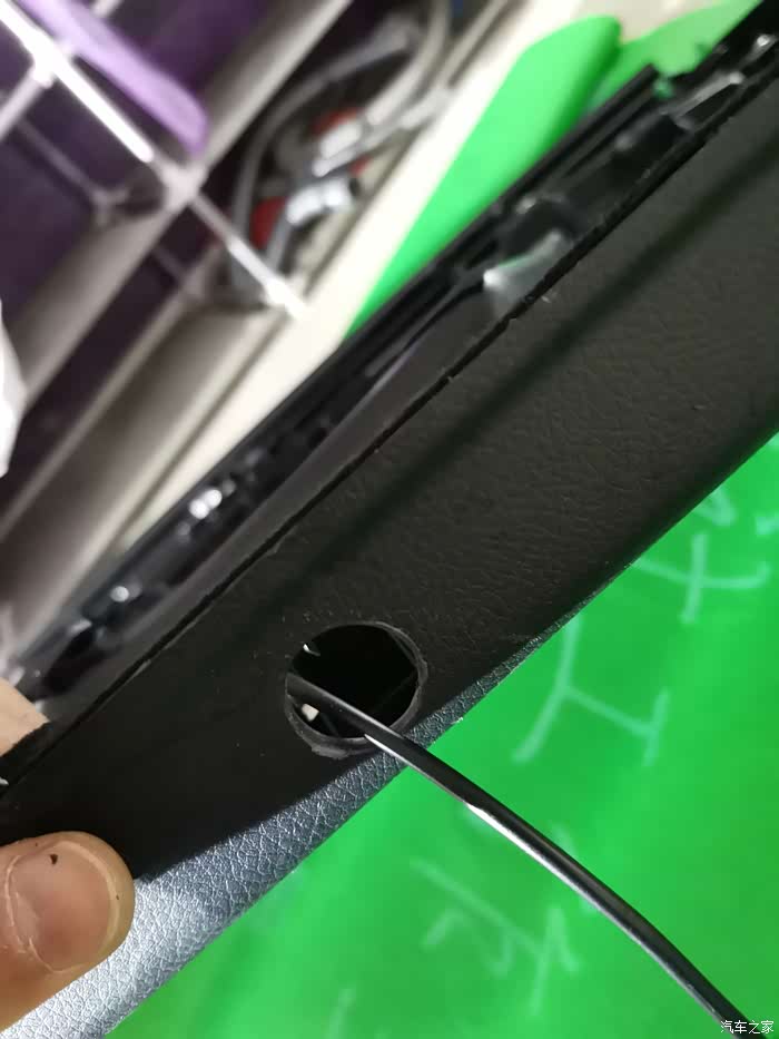 找个电钻,买灯送了开孔器,直接在门板下方就开孔了。位置找到,不能太靠边了。先把线穿进去,这里接的是迎宾灯,开车门以后脚下都可以看得到。灯从外面直接卡进去,以后坏了,也不需要再拆门板的,直接抠出来就可以了。