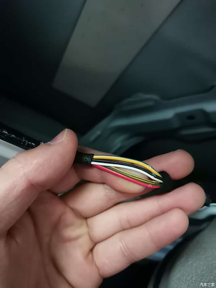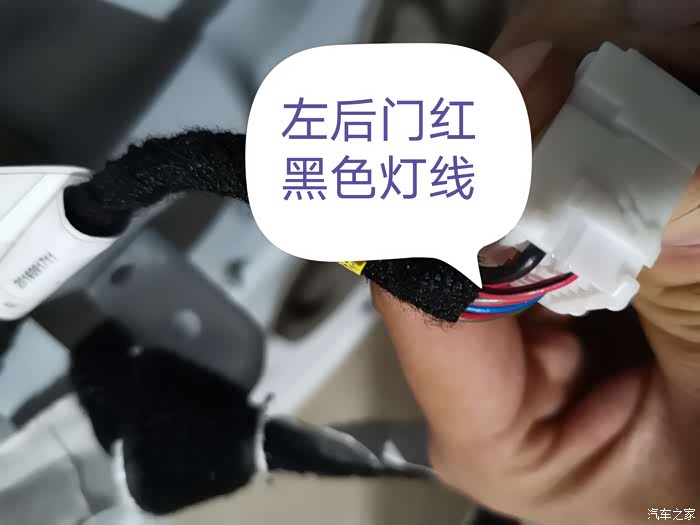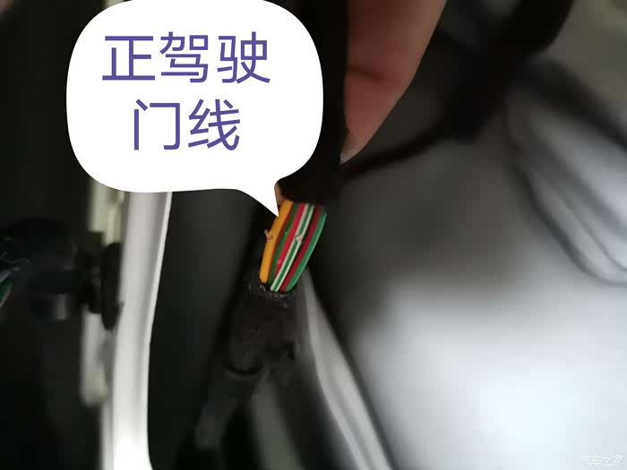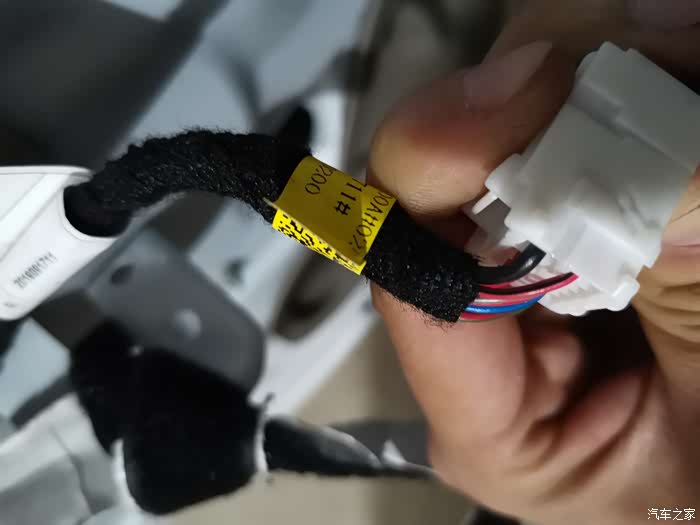 线束包裹的不错,并且有卡扣扣住的,防止晃动产生异响。这根黄色线是门线,是负极线,待会接灯会用到,并且后备箱门和其他车门都会接到主驾驶门上这根线.